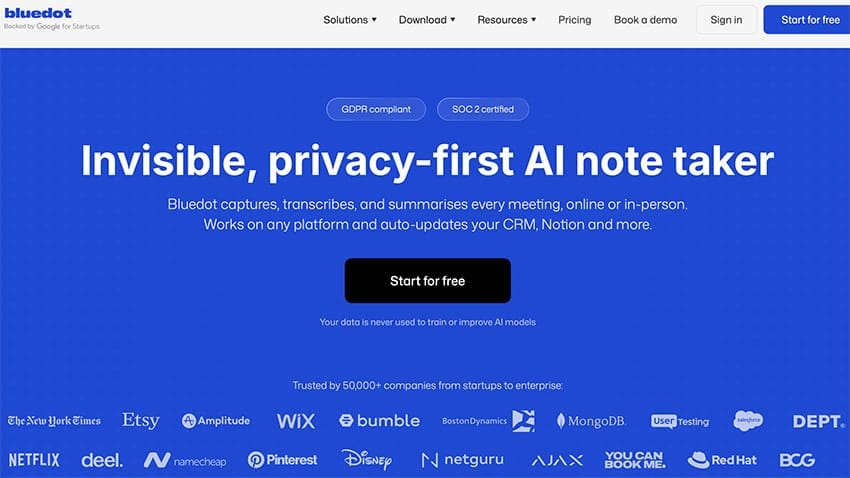 Bluedot AI Note Taker is bot-free, which matters more on sales calls than almost anywhere else. Most note-taking tools join your call as a named participant “AI Notetaker has entered the meeting” which creates an awkward moment with prospects who weren’t expecting it. Bluedot records through a Chrome extension or desktop app, entirely on your end, with nothing appearing in the attendee list.For sales teams whose calls involve first impressions and trust-building, this removes a friction point that most tools simply ignore.The transcription covers 100+ languages, which is increasingly relevant as sales teams work across markets and prospects join from different countries. Summaries are structured and ready to use, and an AI chatbot lets you search across your entire call history “what did the prospect at [company] say about their current supplier?” and get a direct answer rather than hunting through transcripts.Transcripts stay private by default, which matters when your calls contain pricing discussions, competitive positioning, or information you’d rather not auto-distribute. The Business plan integrates directly with Salesforce and HubSpot, pushing meeting notes into deal records automatically.iOS and Android apps cover in-person sales meetings and site visits, not just video calls.Pricing: Free plan (5 lifetime meetings). Basic from £11/user/month. Business plan (CRM integrations) from £26/user/month.Best for: Sales teams where call tone and client rapport matter, and where a visible recording bot would create friction.