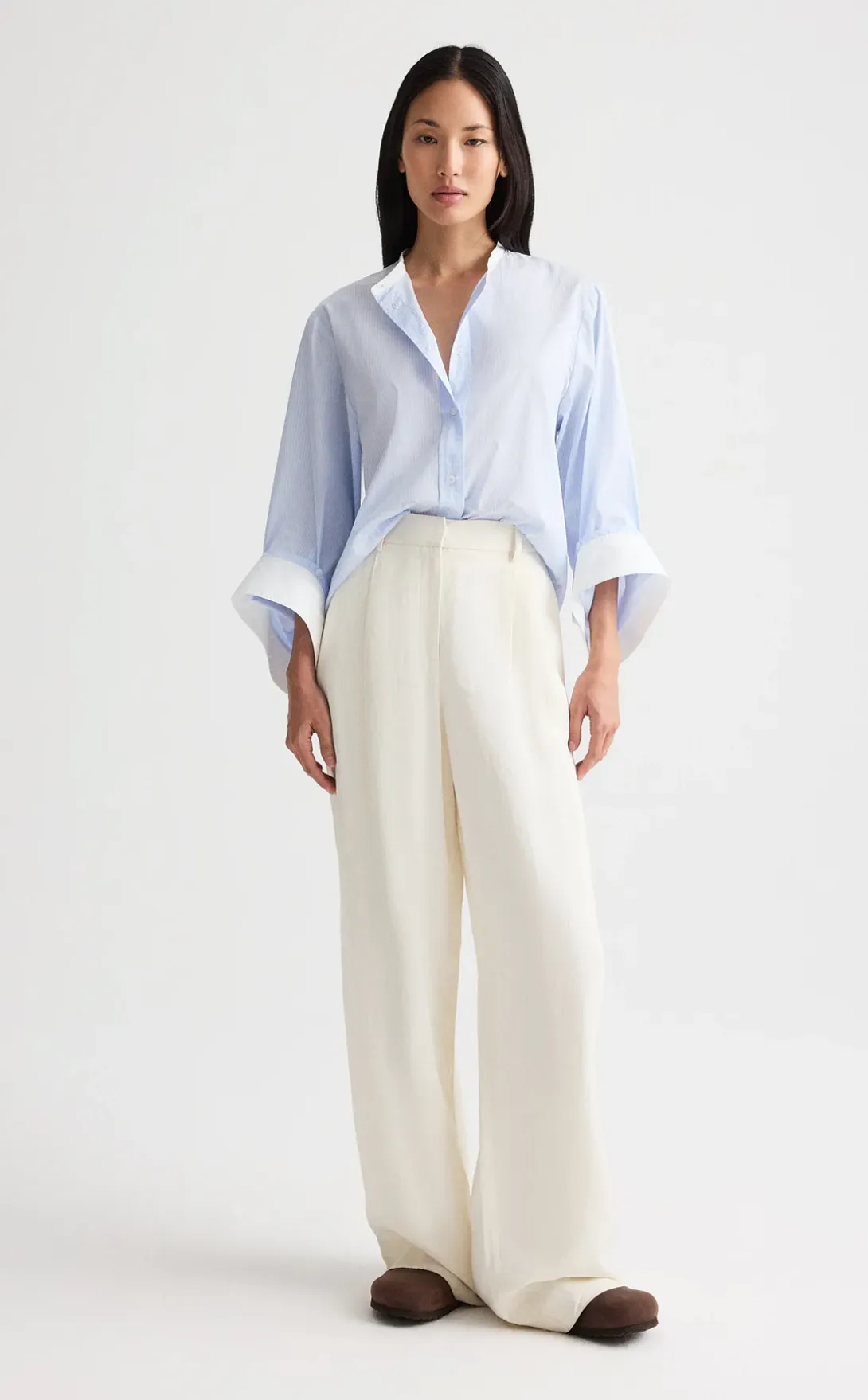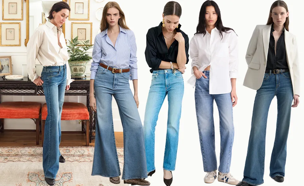 The second is a poplin shirt with jeans, which needs little explanation. Straightforward, but the details matter. I like the shirt oversized, unbuttoned, sleeves rolled, and tucked in. I want it to project a relaxed vibe and those small adjustments are what make the difference between looking effortless and overthought. I’m wearing the Celia jean from Nili Lotan – a brand I consistently rely on for fit, style and quality. The medium rise hugging the hips lands perfectly to contain the volume of the shirt, while the wide leg skims without clinging. A low heel helps create an elongated look. Adding a belt is optional.