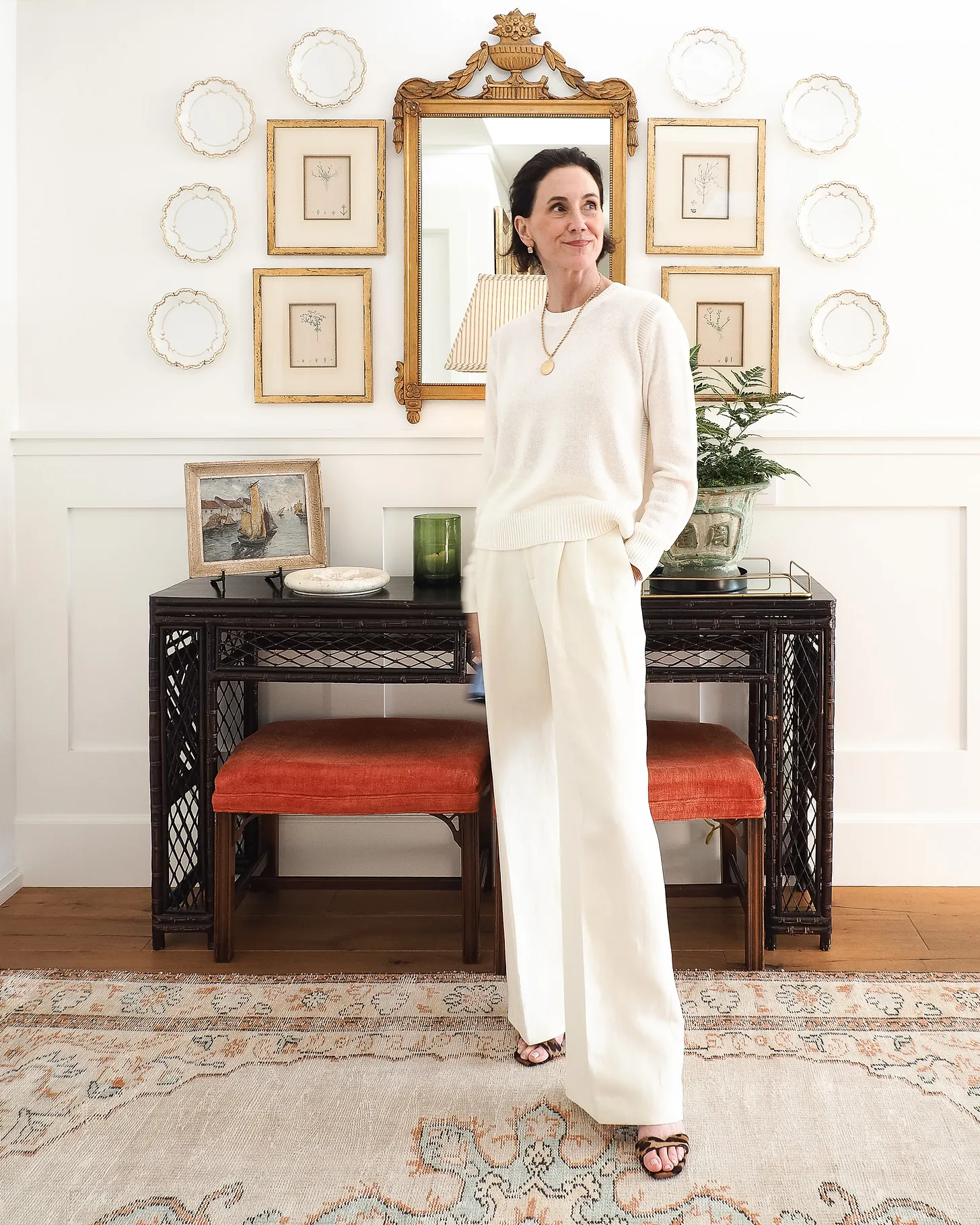 The second is a poplin shirt with jeans, which needs little explanation. Straightforward, but the details matter. I like the shirt oversized, unbuttoned, sleeves rolled, and tucked in. I want it to project a relaxed vibe and those small adjustments are what make the difference between looking effortless and overthought. I’m wearing the Celia jean from Nili Lotan – a brand I consistently rely on for fit, style and quality. The medium rise hugging the hips lands perfectly to contain the volume of the shirt, while the wide leg skims without clinging. A low heel helps create an elongated look. Adding a belt is optional.