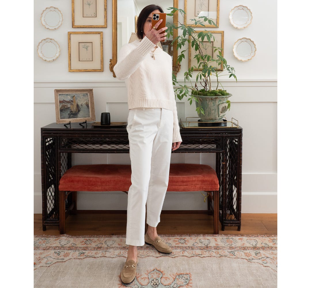 A GOOD, BASIC WHITE PANT: Taking the same ivory cropped cashmere sweater and styling it with a great pair of Vince cotton chinos in white. My closet has lacked a pant like this for years as I’ve favored a wider leg silhouette. These sit slightly below the waist, have a bit of stretch and hit above ankle. My rule for white pants is the same in all fabrications…always slightly loose.