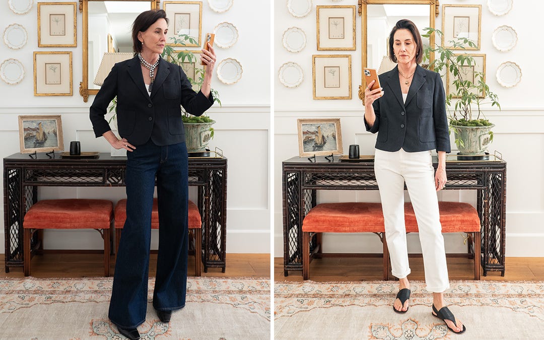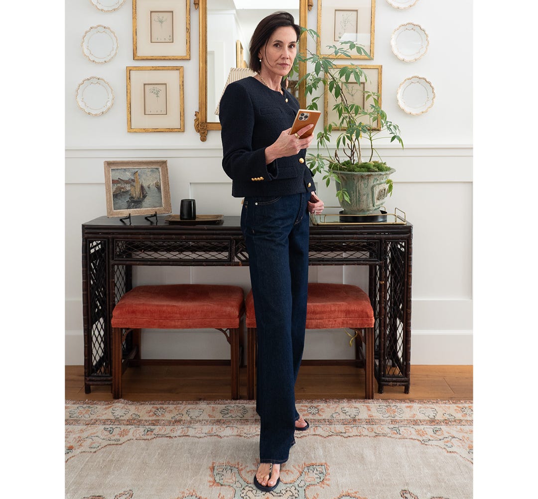 JEANS WITH A BLAZER: Introducing a shrunken blazer to the mix. If you’ve been a longtime reader, you know how much I love a shrunken blazer. Mine is a black linen Dries Van Noten from 2024, with The Row heeled loafer (old), and a pearl tassel necklace I dug out of a drawer from many, many years ago.