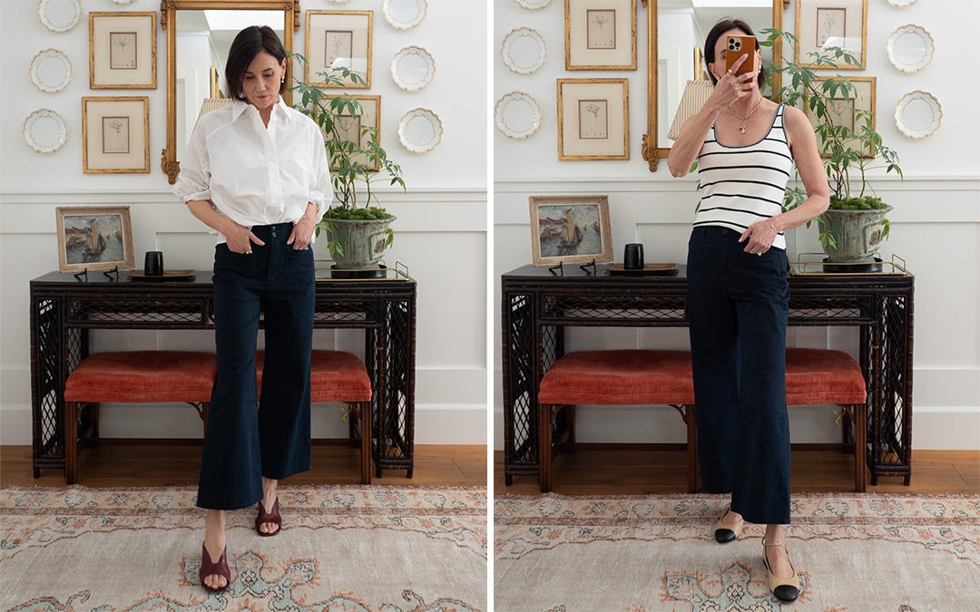 NAVY PANTS: I’m starting with a new pair of Veronica Beard navy cotton pants. I recently noticed my closet was lacking in casual pants that weren’t jeans. I’m also on a navy binge. These pants solved for both of those issues. I like a cropped pant for summer to style with sandals – flats or heels. These have a good amount of stretch for comfort and keep a flattering shape. Wearing with a COS white poplin top and Dries Van Noten sandals from 2023. These burgundy sandals or these from Dries Van Noten are both great options.